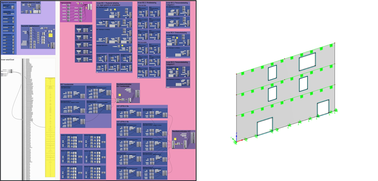 In de software Grasshopper is een parametrische script gemaakt voor het berekenen van betonnen stabiliteitswanden. Doormiddel van een Excel-bestand met de constructieve gegevens, kan er een rekenmodel worden gegenereerd in RFEM. Hierdoor is de creatie van data-gedreven informatie compleet en is een deel van het werkproces geautomatiseerd.